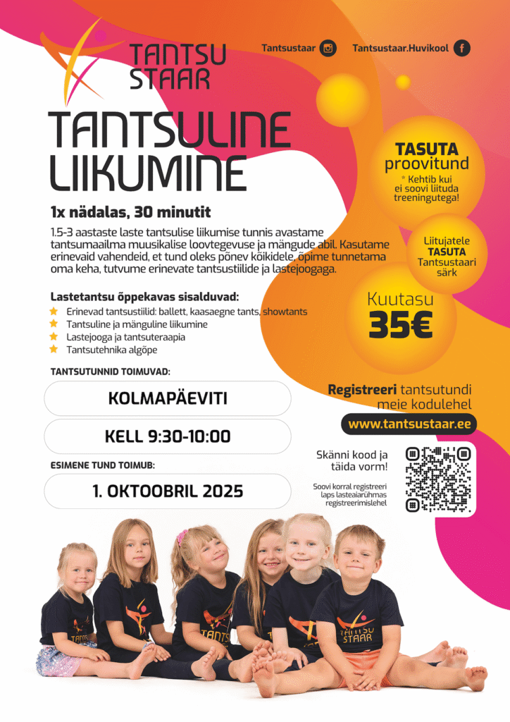 Time 9:30 – 10:00 Fee: 35€ Class lasts: 30 minutes Dance classes are conducted by Tantsustaar Huvikool. More information and registration on the attached poster. First class: 01.10.2025